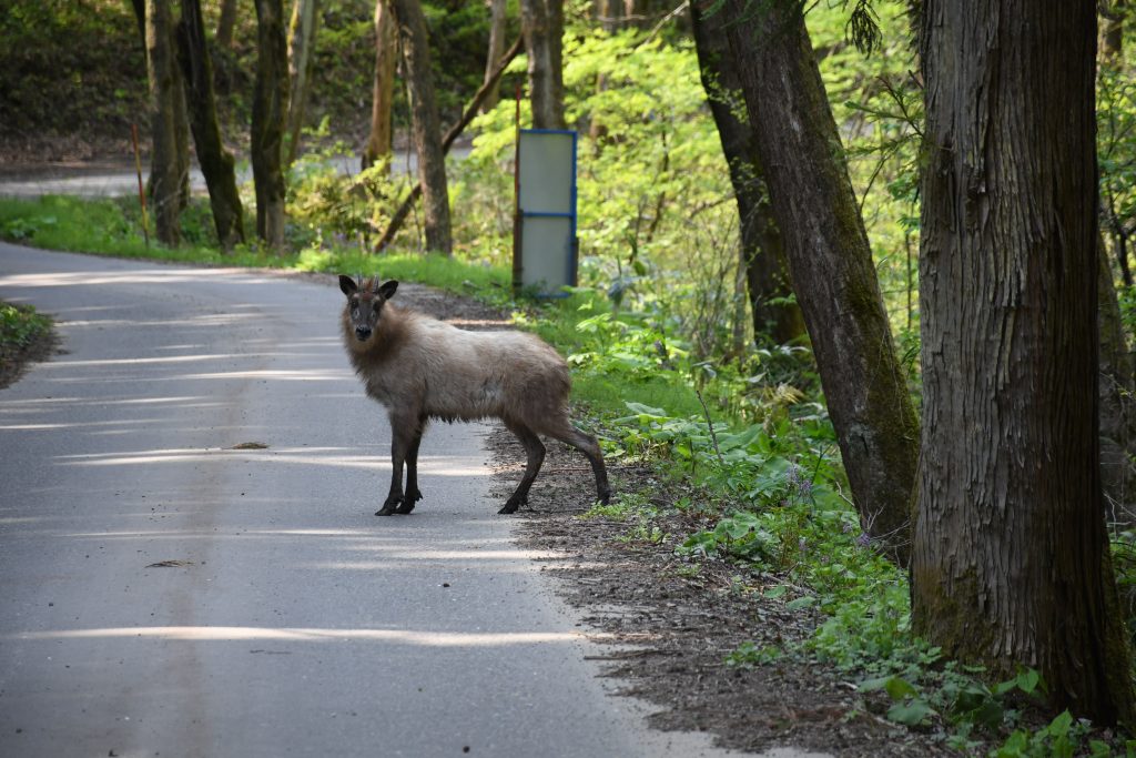 取材中にカモシカに遭遇。10数㍍先から、こちらをじっと見ていました。時間にして10秒足らず、あっという間に崖を登って姿が見えなくなりました。  大きな幹線道路から数分程度の森の中。改めて、上越市の自然の豊かさを感じた出来事でした。(報道記者K)