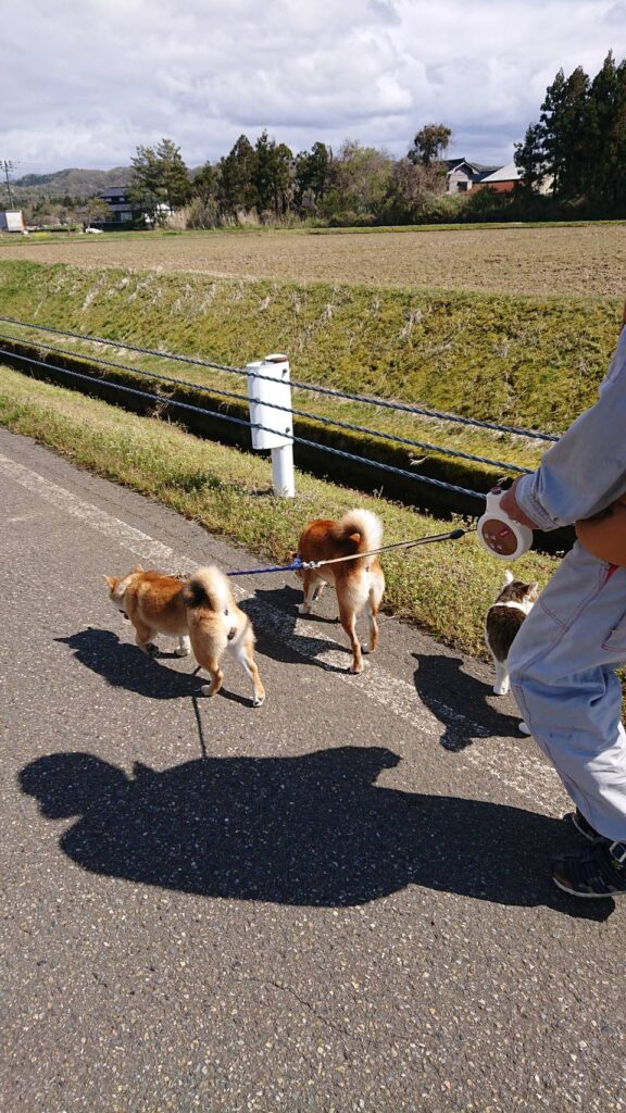 私も行くとばかり、追いつき足元にスリスリ 仲良く散歩 楽しんでます