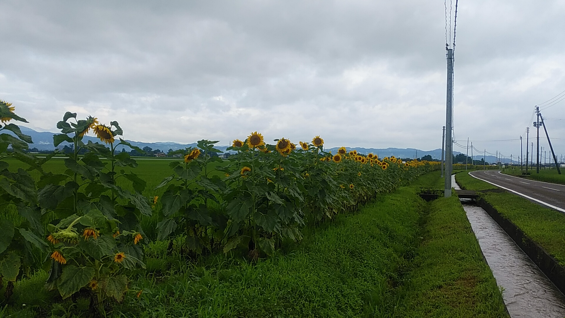 上越市上真砂交差点から上越市富岡へ向かう道路沿い、距離にして約1キロ近く、ひまわりが咲いています。 梅雨が明けて、ひまわりの花が似合う青空になってほしいと思います。