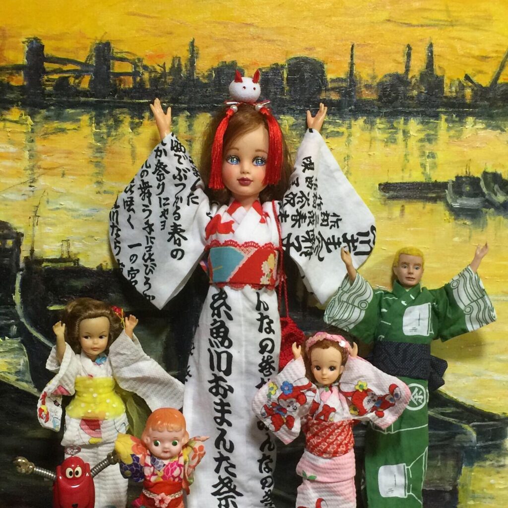 今年はコロナ禍でおまんた祭りが中止になったので、昔の手拭いで作った浴衣をお人形に着せて飾っています。この手拭いは地元民には懐かしく、まだ持っている家庭も多い。背景は91の父が描く姫川港。